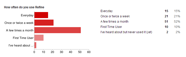 The following graphic shows that only user with over one year experiences with OpenRefine have reported bug or request new feature. Surprisingly over 60% of the user don't know to report something have been using Refine for over a year.